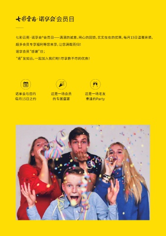 会员日 七彩云南·诺享会®会员日⸺满满的诚意,用心的回馈,实实在在的优惠,每月15日温暖来袭, 超多会员专享福利等您来享,让您满载而归! 诺享会员“感谢”日; “诺”友如云,一起加入我们吧!尽享数不尽的优惠! 诺享会与您的 这是一场会员 这是一场老友 每月15日之约 的专属盛宴 重逢的Party