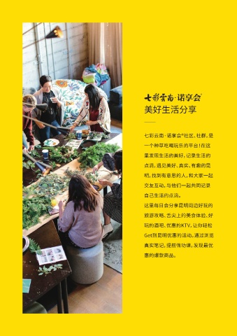 美好生活分享 七彩云南·诺享会®社区、社群,是 一个种草吃喝玩乐的平台!在这 里发现生活的美好,记录生活的 点滴,遇见美好、真实、有趣的昆 明,找到有意思的人,和大家一起 交友互动,与他们一起共同记录 自己生活的点滴。 这里每日会分享昆明周边好玩的 旅游攻略、舌尖上的美食体验、好 玩的酒吧、优惠的KTV,让你轻松 Get到昆明优惠的活动。通过浏览 真实笔记,提前做功课,发现最优 惠的爆款商品。