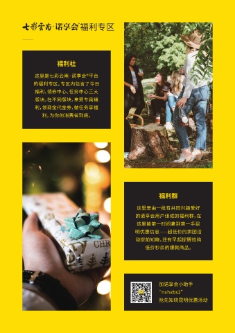 福利专区 福利社 这里是七彩云南·诺享会®平台 的福利专区,专区内包含了今日 福利、领券中心、任务中心三大 版块。在不同版块,享受专属福 利,领现金代金券,做任务享福 利,为你的消费省到底。 福利群 这里是由一批有共同兴趣爱好 的诺享会用户组成的福利群,在 这里能第一时间拿到第一手昆 明优惠信息⸺超低价的拼团活 动提前知晓,还有早起提醒抢购 低价秒杀的爆款商品。 加诺享会小助手 “nxhxbs2” 抢先知晓昆明优惠活动