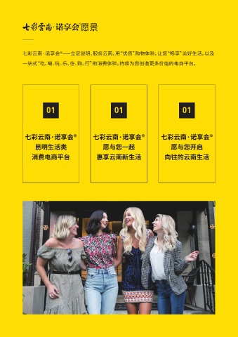 愿景 七彩云南·诺享会®⸺立足昆明、服务云南,用“优质”购物体验,让您“畅享”美好生活,以及 一站式“吃、喝、玩、乐、住、购、行”的消费体验,持续为您创造更多价值的电商平台。 01 01 01 七彩云南·诺享会® 七彩云南·诺享会® 七彩云南·诺享会® 昆明生活类 愿与您一起 愿与您开启 消费电商平台 惠享云南新生活 向往的云南生活