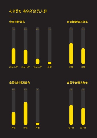会员人群 会员年龄分布 会员婚姻情况分布 43% 39% 15% 3% 57% 43% 20至35岁 35至45岁 45至55岁 其他 已婚 未婚 会员性别情况分布 会员子女情况分布 35% 62% 3% 54% 46% 男性 女性 其他 有子女 无子女