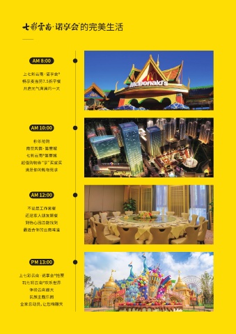 的完美生活 AM 8:00 上七彩云南·诺享会® 畅享麦当劳7.5折早餐 开启元气满满的一天 AM 10:00 秒杀抢购 南亚风情·第壹城 七彩云南®第壹城 超值购物券“享”买就买 满足你的购物需求 AM 12:00 不论是工作套餐 还是家人朋友聚餐 到怡心园总能找到 最适合你的云南味道 PM 13:00 上七彩云南·诺享会®抢票 玩七彩云南®欢乐世界 体验云南最大 民族主题乐园 全家总动员,让您嗨翻天